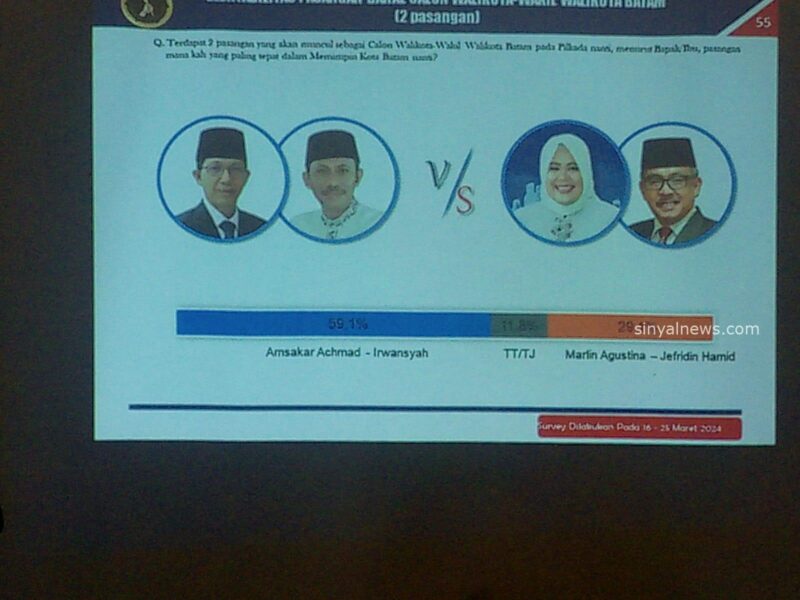 Ia menjelaskan, elektabilitas dua calon Wali Kota Batam, Amsakar Ahmad unggul 59,8% dibandingkan Marlin Agustina 32,9%. Dengan tidak menjawab 7,3%.