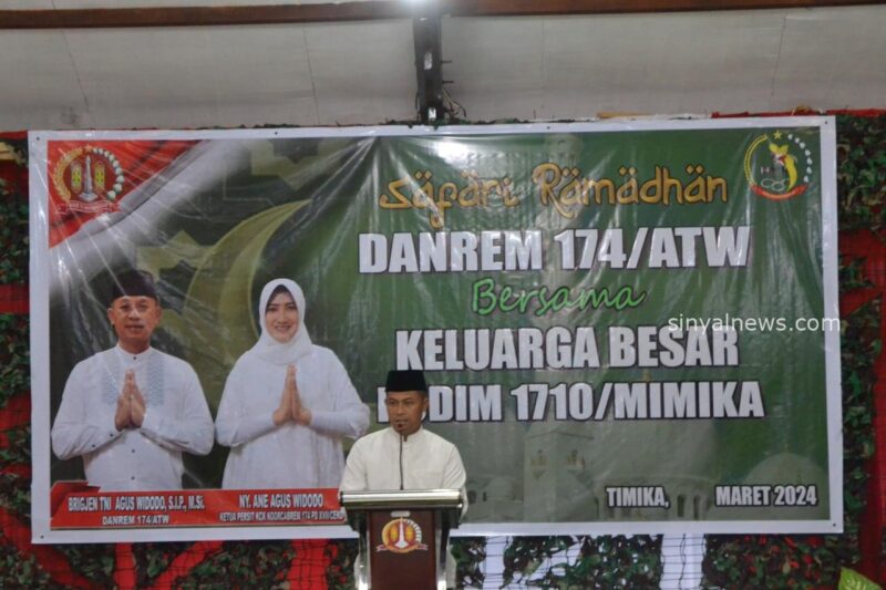 Timika SINYALNEWS.COM — Komandan Korem 174/ATW Brigjen TNI Agus Widodo, S.I.P., M.Si. didampingi Ny. Ane Agus Widodo (Ketua Persit KCK Koorcab Rem 174) melaksanakan Safari Ramadhan bersama keluarga besar Kodim 1710/Mimika. kegiatan ini bertempat di Makodim 1710/Mimika, jalan Agimuga Mile 32, Distrik Kuala Kencana, Kab. Mimika, Sabtu (30/3/2024).