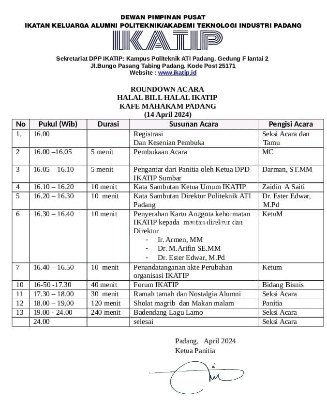 Izinkan kami melalui surat digital Panitia Pelaksana kegiatan OPEN HOUSE IKATIP 2024 Mengundang keluarga besar Ikatip , kiranya berkenan hadir di tengah kami dalam agenda OPEN HOUSE IKATIP – HALAL BI HALAL 2024, bertempat di Cafe Mahakam, Jalan Mahakam, GOR H Agus Salim, Padang, pada pukul 16.00 WIB sd selesai.