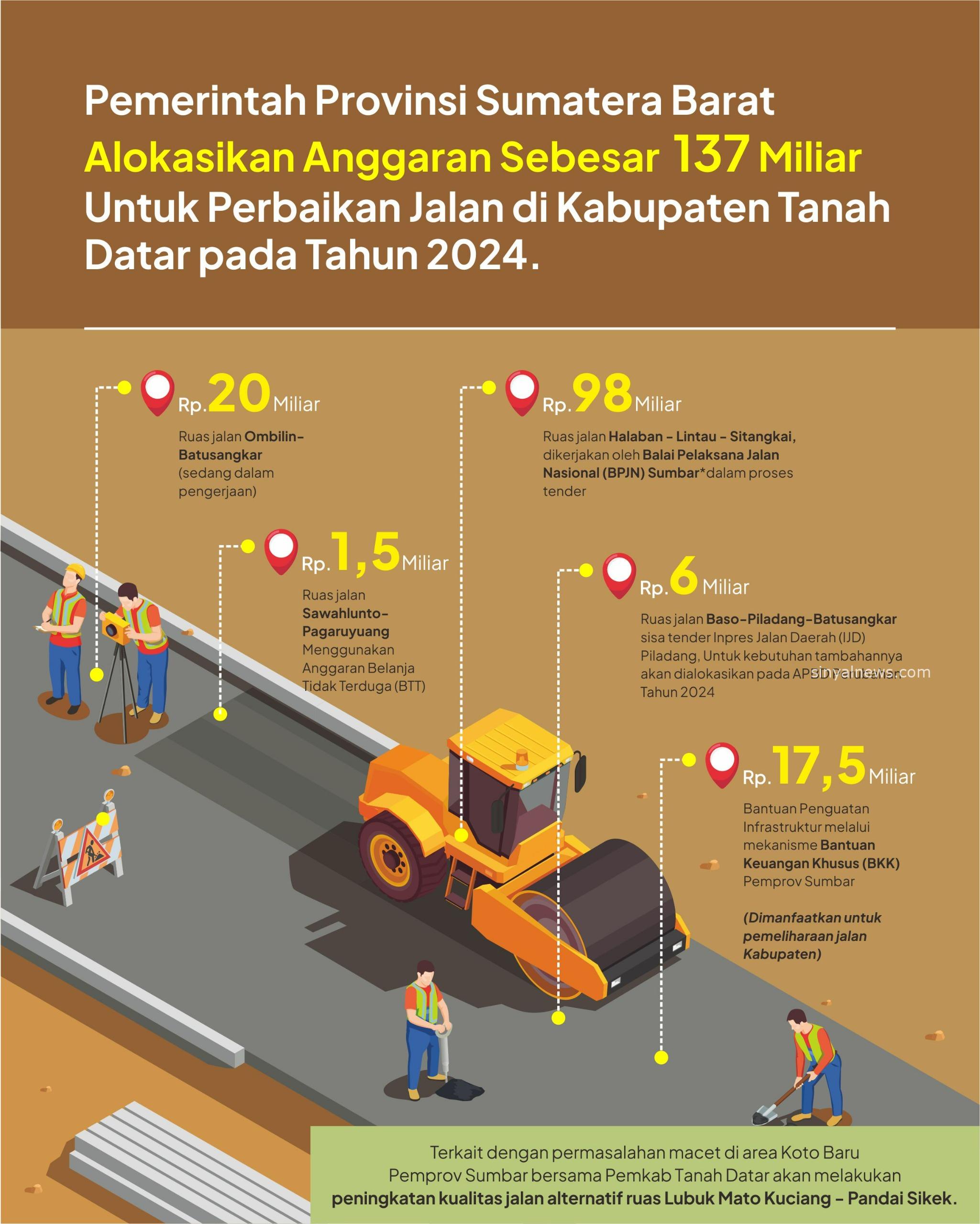 Padang, Sinyalnews.com,– Pemerintah Propinsi Sumatera Barat mengalokasikan anggaran sebesar 137 Miliar Rupiah untuk perbaikan jalan di Kabupaten Tanah Datar.