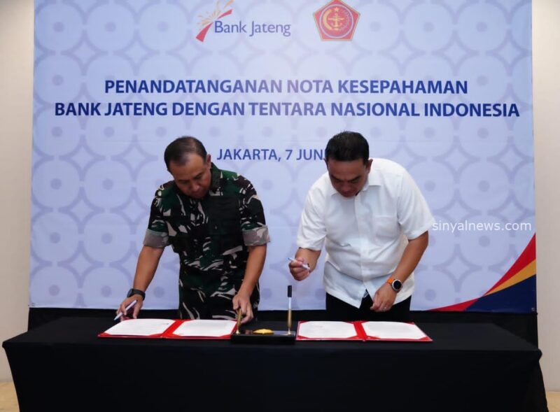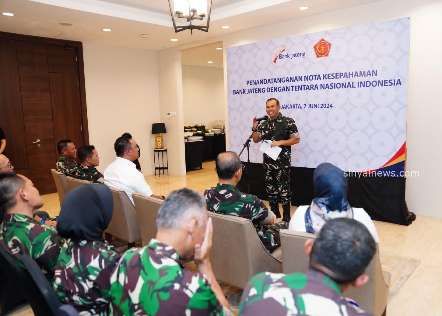 Puspen TNI SINYALNEWS.COM — Markas Besar Tentara Nasional Indonesia (Mabes TNI) yang diwakili Aspers Panglima TNI Marsda TNI Mohammad Syafii, S.I.P., M.M. menandatangani nota kesepahaman atau Memorandum of Understanding (MoU) tentang Penyediaan dan Pemanfaatan Jasa Layanan Perbankan bagi Anggota TNI, dengan Plt. Direktur Utama Bank Jateng Irianto Harko Saputro, bertempat di Ruang VVIP Minangkabau Suvarna Golf Halim Perdanakusuma, Jakarta Timur, Jum’at (7/6/2024).
