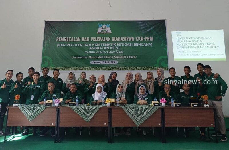 PADANG SINYALNEWS.COM – Pusat Pengembangan dan Pengabdian Masyarakat (PPM) Universitas Nahdatul Ulama Sumatera Barat (UNUSB) menggelar Pembekalan dan Pelepasan Peserta KKN -PPM (KKN Reguler dan KKN Tematik Mitigasi Bencana Angkatan VI Tahun 2024 di Aula Kampus UNU Sumatera Barat pada Selasa 16/07/24. Kegiatan ini diikuti oleh Pimpinan dan Dosen serta Mahasiswa yang akan melaksanakan kegiatan Kuliah Kerja Nyata ke Daerah yang sudah ditentukan sebanyak 113 orang Mahasiswa.