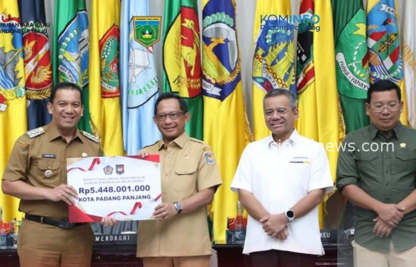 Padang Panjang, SINYALNEWS.COM,- — Menteri Dalam Negeri, Muhammad Tito Karnavian didampingi Wakil Menteri Keuangan, Suahasil Nazara serahkan Dana Insentif Fiskal (DIF) kepada Penjabat (Pj) Wali Kota, Sonny Budaya Putra, AP, M.Si di Gedung Sasana Bhakti Kemendagri dalam Rapat Rutin Pengendalian Inflasi, Senin (5/8/2024).