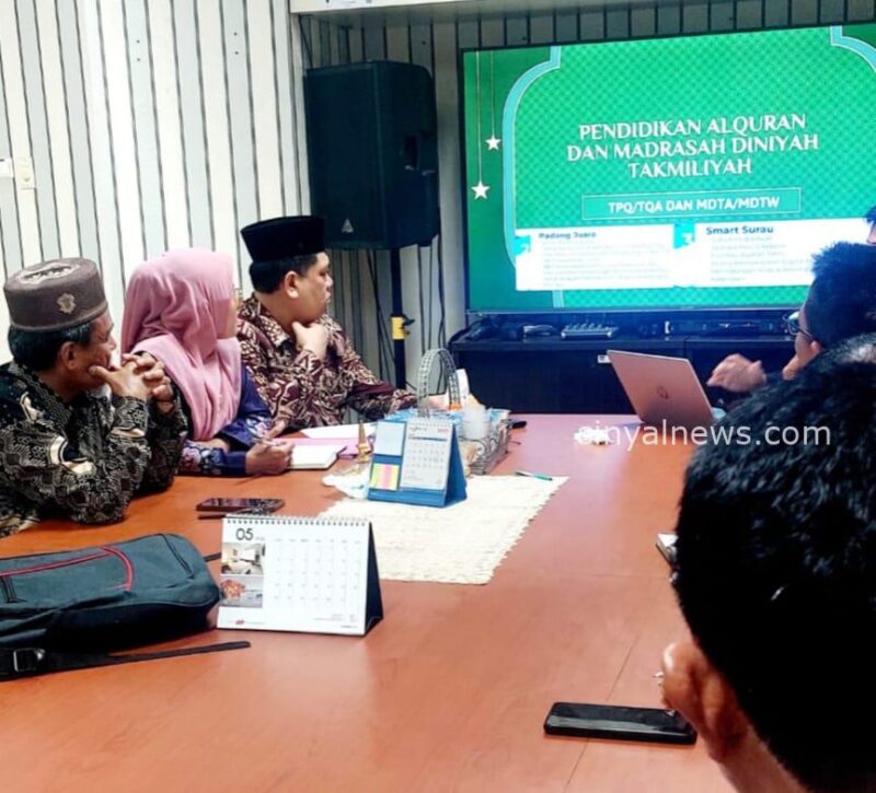 Padang, Sinyalnews .com — Jum’at, 7 Februari 2025 –. Kepala Kantor Kementerian Agama Kota Padang, diwakili Kepala seksi Pendidikan Diniyah dan Pondok Pesantren,Dian Kharaty bersama Kabag Kesejahteraan Rakyat (Kesra) Pemko Padang, Kepala Dinas Pendidikan Kota Padang, Ketua Forum Komunikasi Diniyah Takmiliyah (FKDT) Kota Padang, Ketua BKS TPQ-TQA Kota Padang, dan Tim Transisi Wali Kota terpilih mengikuti Rapat Koordinasi Program SMART SURAU yang bertempat di Aula Kabag Kesra Pemko Padang.