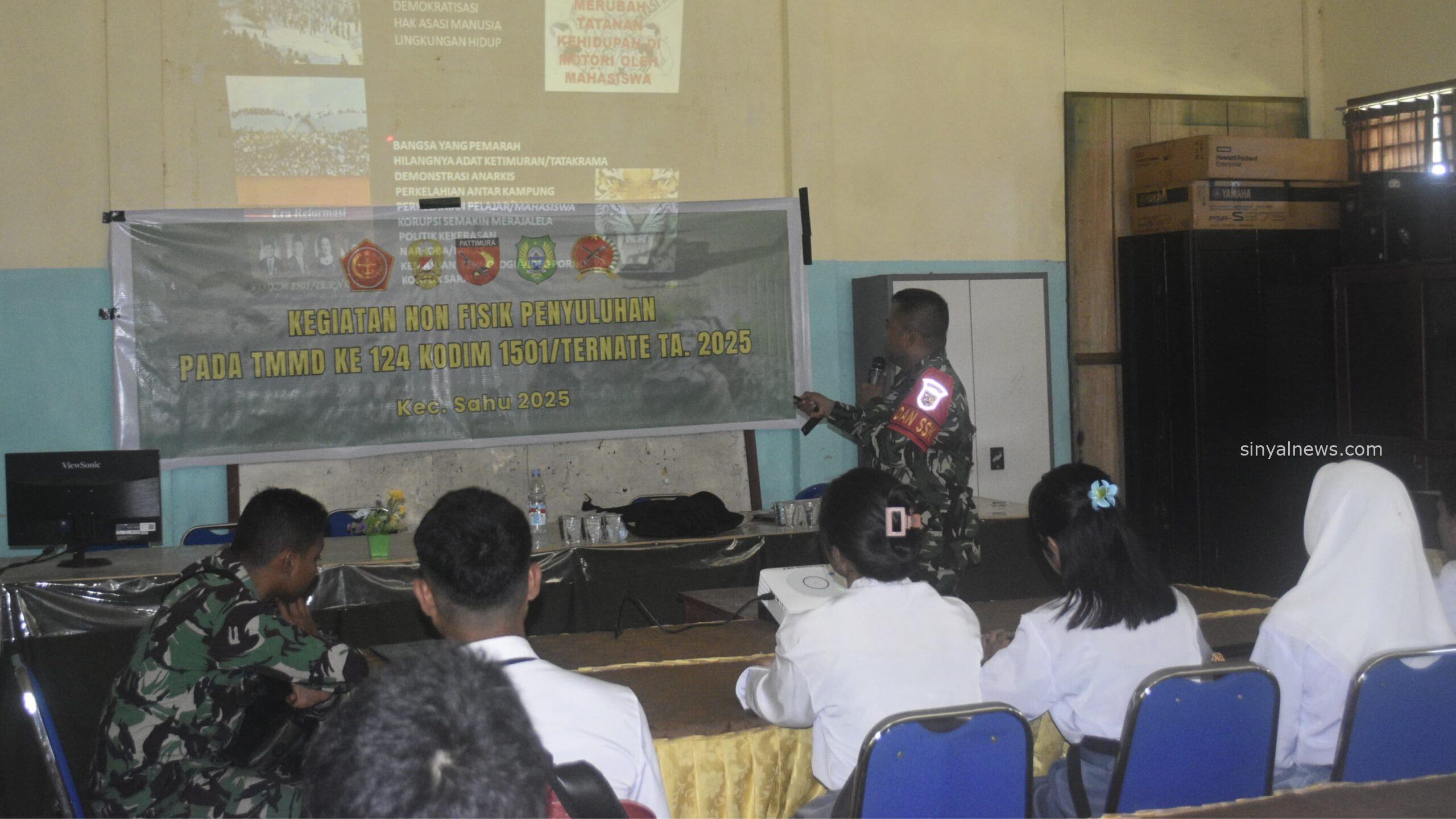Halmahera Barat-SINYALNEWSS – Satgas TMMD Ke-124 Kodim 1501/Ternate memberikan penyuluhan wawasan kebangsaan kepada siswa SMK Fomarimoi, Kecamatan Sahu, Kabupaten Halmahera Barat. Penyuluhan ini merupakan salah satu program non fisik TMMD yang bertujuan untuk menanamkan nilai-nilai kebangsaan dan cinta tanah air kepada generasi penerus bangsa. Rabu (21/5/2025).