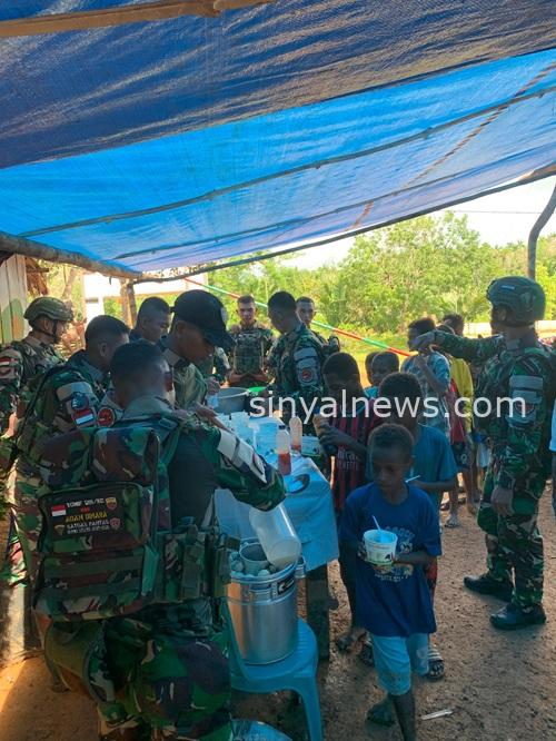 Bertempat di halaman Pos Kombut, kegiatan ini disambut warga dengan antusias. Tak hanya menerima bantuan sembako berupa beras, minyak goreng, dan mie instan, mereka juga diajak bersantai bersama sambil menikmati sajian bakso hangat yang dimasak langsung oleh prajurit Satgas.