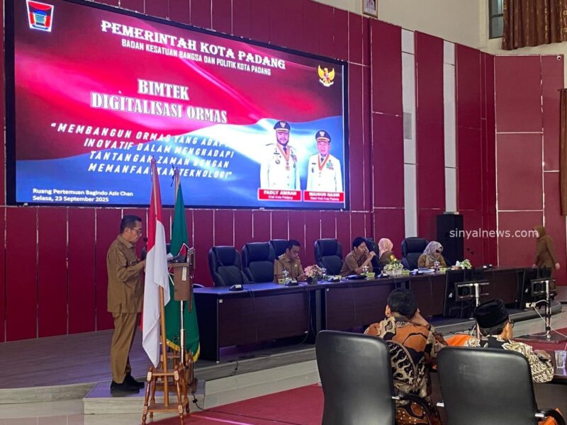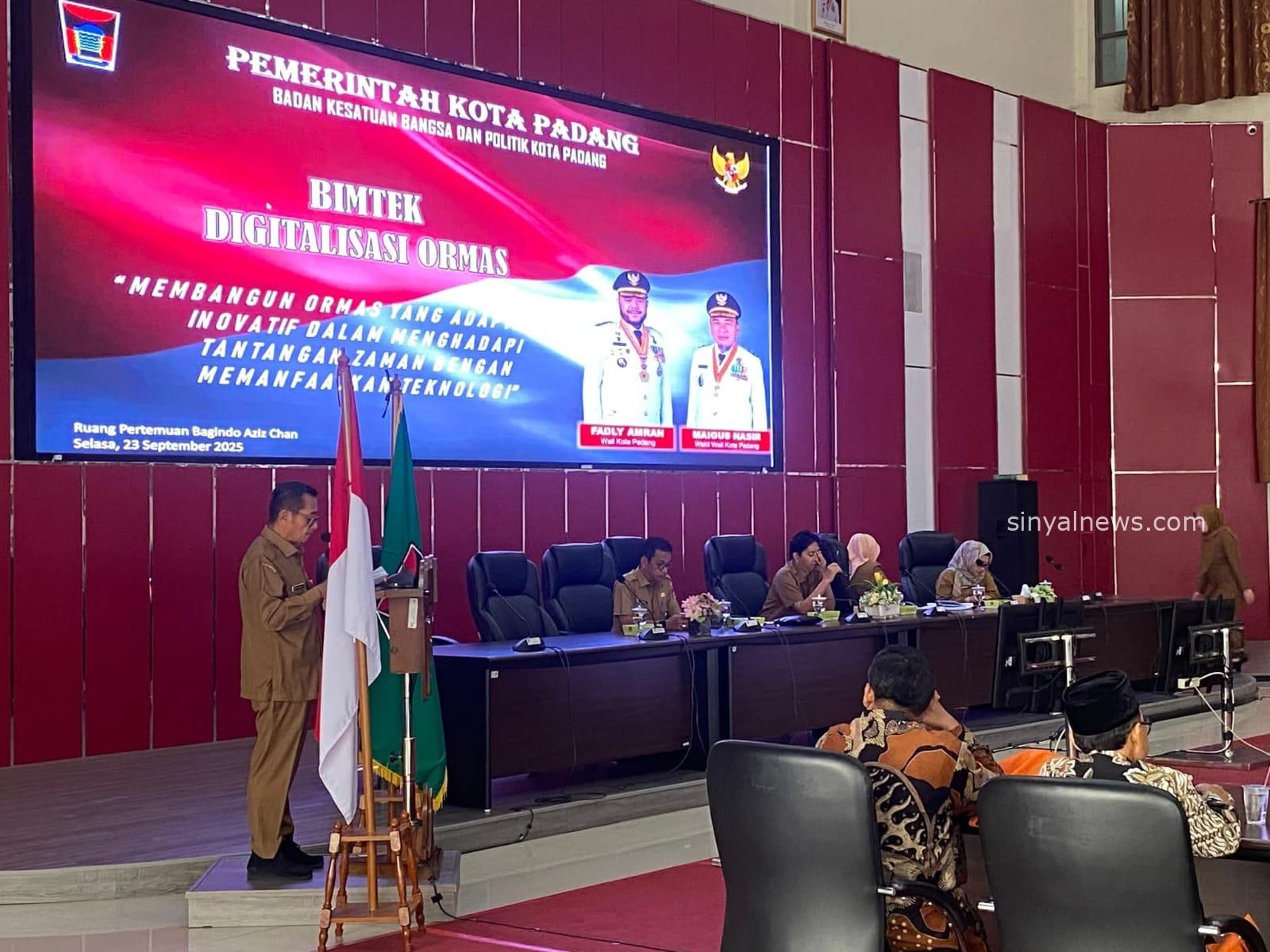 PADANG,Sinyalnews.com, — Sebanyak 207 organisasi kemasyarakatan (ormas) yang terdaftar di Pemerintah Kota Padang mengikuti bimbingan teknis (bimtek) digitalisasi, di Balai Kota Padang, Selasa (23/9/2025).