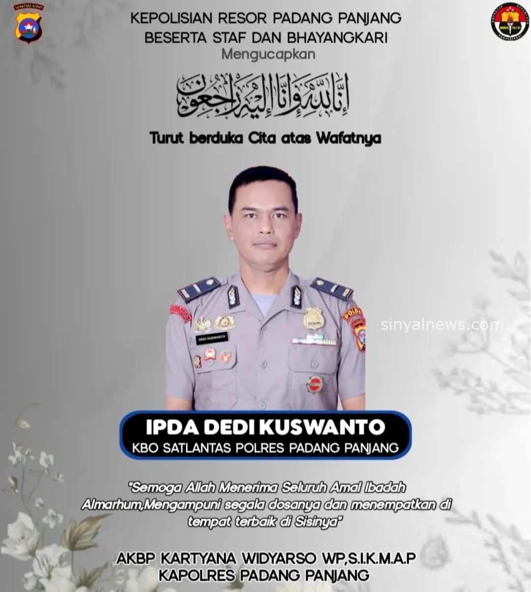 Padang Panjang,Sinyalnews.com-Jajaran Kepolisian Resor Padang Panjang berduka. Salah satu perwira terbaiknya, IPDA Dedi Kuswanto, yang menjabat sebagai KBO Satlantas Polres Padang Panjang, berpulang ke Rahmatullah. Kabar kepergian almarhum meninggalkan duka mendalam bagi keluarga, rekan sesama anggota Polri, serta masyarakat yang selama ini mengenalnya sebagai sosok polisi humanis dan berdedikasi.