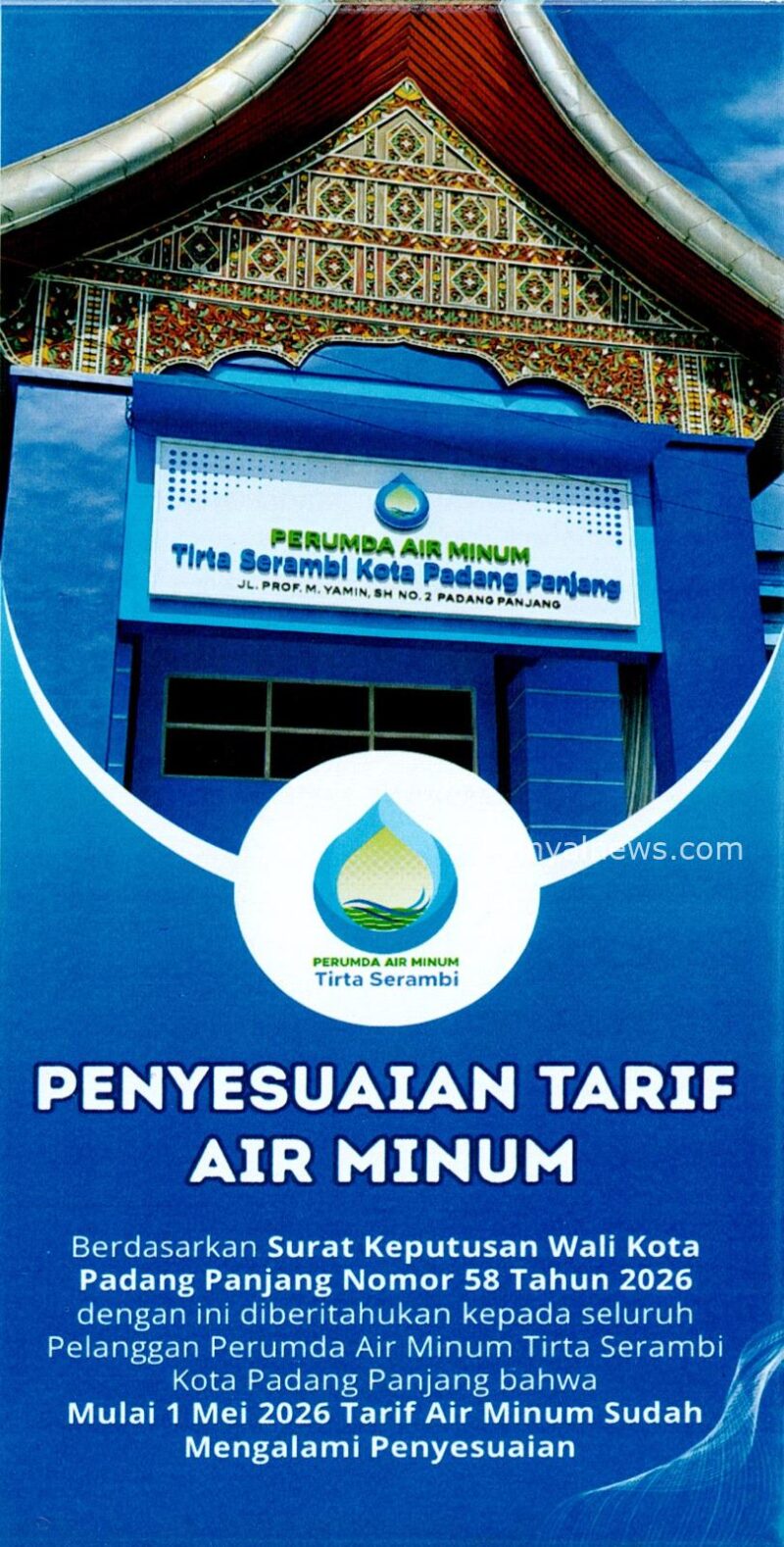 Padang Panjang.Sinyalnews.com— Di bawah ornamen rumah gadang yang kokoh, pengumuman itu berdiri tanpa banyak kata. “Penyesuaian Tarif Air Minum.” Sebuah kalimat formal yang, bagi sebagian orang, mungkin hanya sekadar informasi. Namun bagi ribuan pelanggan Perumda Tirta Serambi, ia adalah sinyal perubahan yang menyentuh langsung dapur rumah tangga.